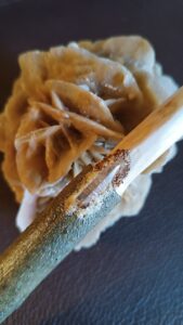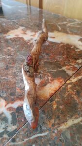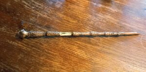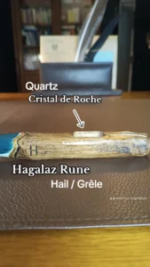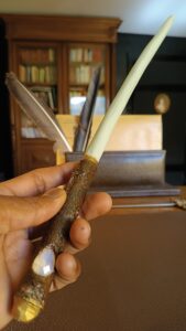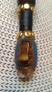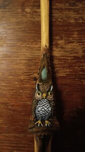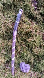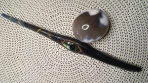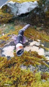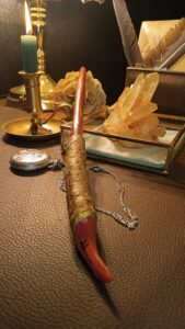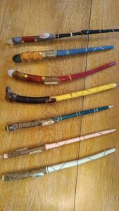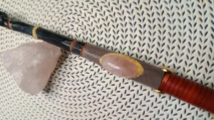 Les baguettes sont toutes fabriquées dans du bois naturel ramassé en forêt afin de leur donner une seconde vie. J’y incruste des pierres semi-précieuses en adéquation avec le bois. Certains modèles sont accompagnés de cuir recyclé (vieux sac à main ou chute de tanneur) et sur demande il est également possible d’y graver des runes. Le bois est ensuite coloré avec une peinture respectueuse des normes environnementales.